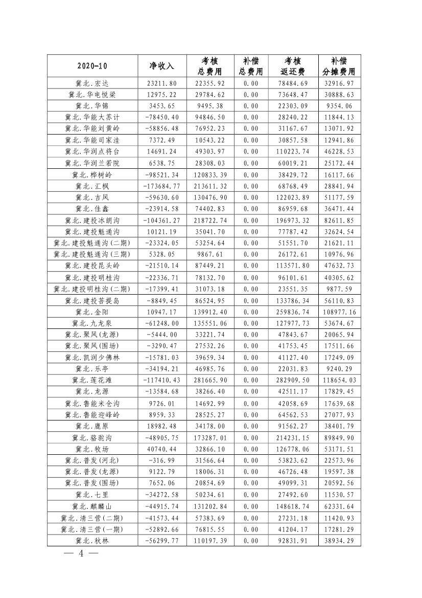 华北监能市场〔2020〕234号 华北电网有限公司,国网北京市、天津市、冀北电力有限公司,京津唐电网各直调电厂、新能源企业: 按照《华北能源监管局关于印发华北区域并网发电厂“两个细则”(2019年修订版)的通知》(华北监能市场〔2019〕254)要求,华北、北京、天津和冀北电网电力调控中心完成了京津唐电网发电企业2020年10月份“两个细则”运行结果计算与统计工作。2020年11月26日,华北电网有限公司向我局报送了2020年10月份“两个细则”运行结果明细清单。现将有关情况通知如下。 一、京津唐电网直调机组 2020年10月,京津唐电网直调机组“两个细则”总考核费用和总补偿费用分别为8294.74万元、4196.27万元。 二、京津唐电网风电场 各风电场2020年10月份的考核总费用983.83万元,补偿分摊总费用410.65万元。 三、京津唐电网光伏电站 各光伏发电站2020年10月份的考核总费用544.37万元,补偿分摊总费用161.94万元。 我局对以上结果进行了审核。截至目前,未接到发电企业对上述结果的争议或申诉报告。按照相关规定,现对2020年10月份京津唐电网直调电厂、各风电场、各光伏电站辅助服务补偿和并网考核结果予以发布。 请华北电网有限公司和国网北京市、天津市、冀北电力有限公司据此文件,及时结算各发电企业2020年10月份“两个细则”费用。 附件:1. 2020年10月份京津唐电网发电厂辅助服务补偿和并网考核费用结算表 2. 2020年10月份京津唐电网风电场并网运行管理运行结算汇总表 3. 2020年10月份京津唐电网光伏发电站并网运行管理运行结算汇总表 京津唐电网2020年10月份“两个细则”试运行结果.pdf国家能源局华北监管局